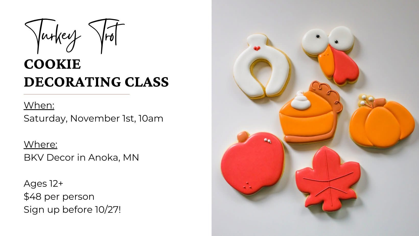 Click HERE to Buy TicketCookie Decorating Class with Biddy Bakehouse. Turkey Trot Thanksgiving-themed Cookie Decorating. $48 per person. Your ticket includes all the supplies, tools, and instructions to decorate 6 cookies. Ages 10 and up. All minors must be accompanied by a paying adult. It's a good idea to bring an apron! Be sure to read all the event details when buying your ticket. Sign up before 10/27!