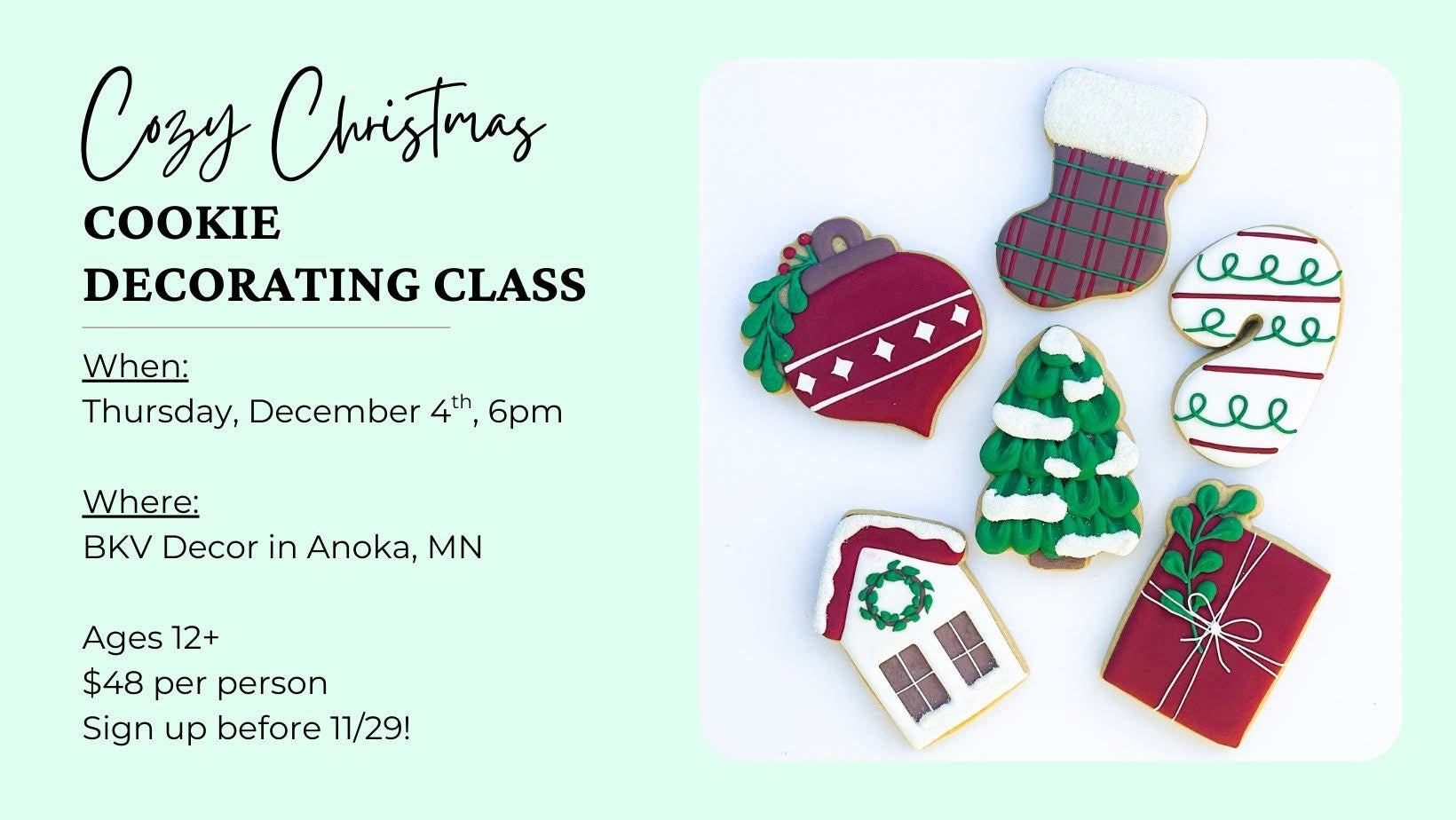 Click HERE to Buy TicketCookie Decorating Class with Biddy Bakehouse. Cozy Christmas-themed Cookie Decorating. $48 per person. Your ticket includes all the supplies, tools, and instructions to decorate 6 cookies. Ages 10 and up. All minors must be accompanied by a paying adult. It's a good idea to bring an apron! Be sure to read all the event details when buying your ticket. Sign up before 11/29!