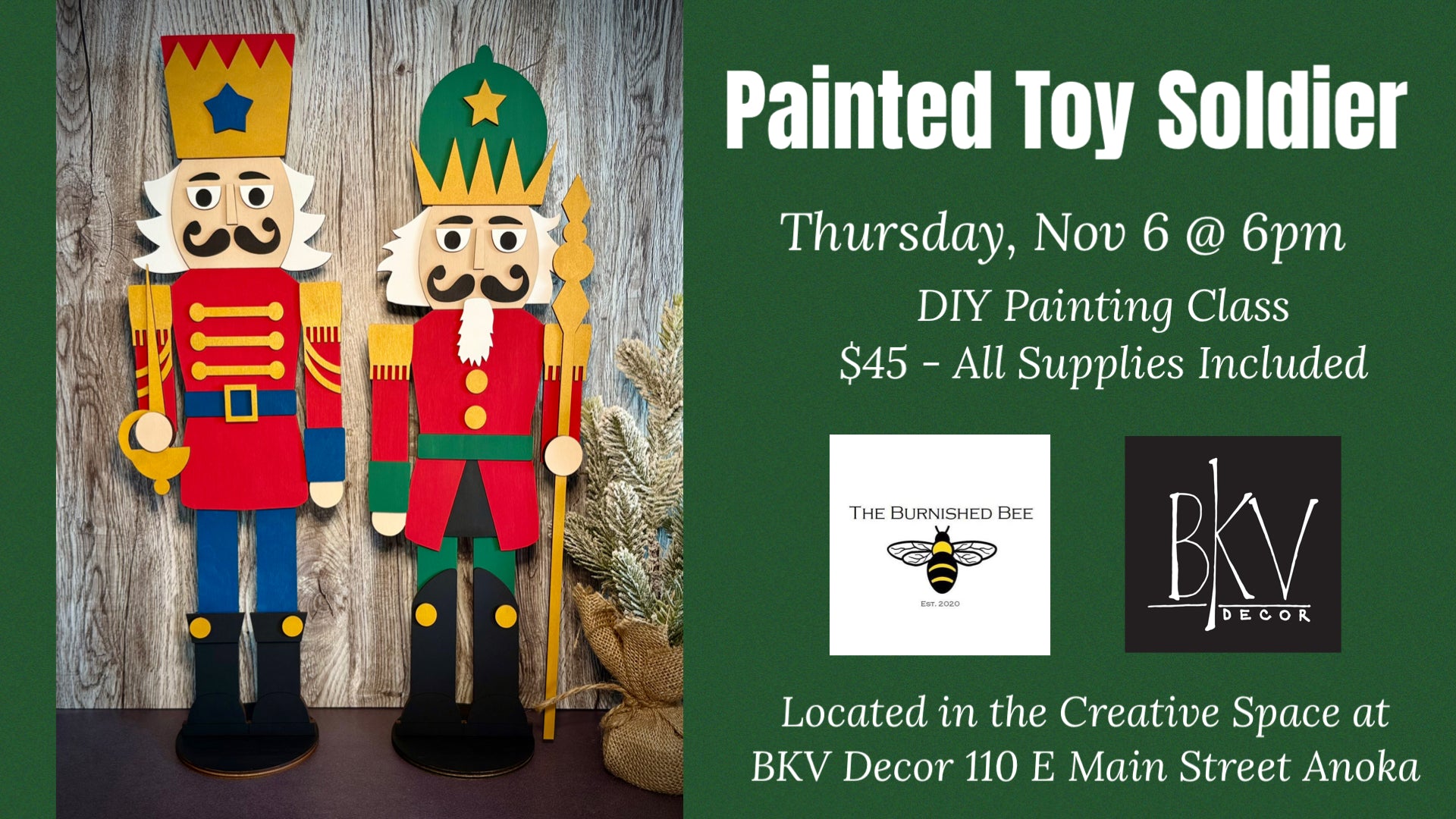 Click HERE to Buy TicketPainted Toy Soldier with The Burnished Bee. Join us at BKV Decor in downtown Anoka to create your very own toy soldier. You get to choose between two different designs. Each Toy Soldier measures about 20" tall x 6" wide. We provide the project and all of the supplies to complete it. Different colored paints are also available to customize your toy soldier to fit your holiday decor. This class takes up two hours from start to finish. Class is limited to 12 seats, don't wait to get your ticket!