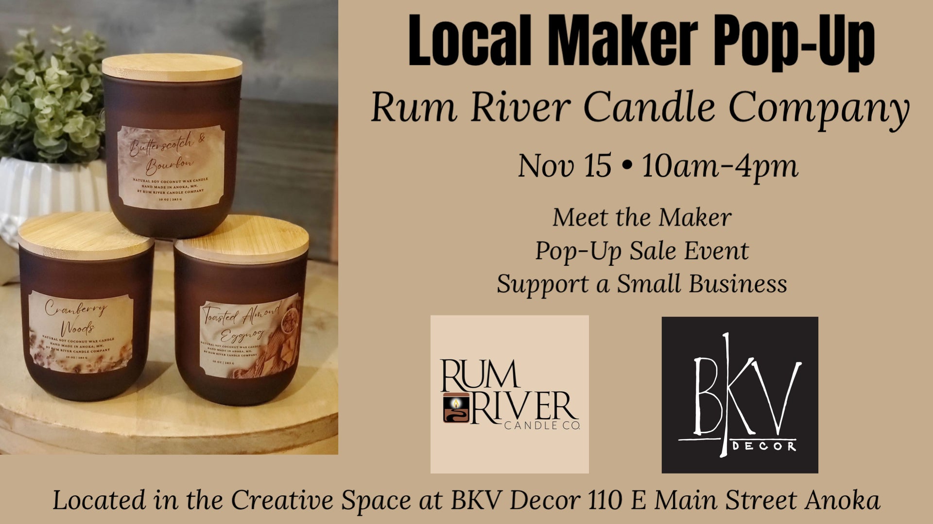 BKV Decor Facebook PageLocal Maker Pop-Up with Rum River Candle Company. Support a local maker! Rum River Candle Company of Anoka will be set up in the creative space with all her latest and greatest products including non-toxic, clean burning soy candles and more! Grab some locally made gifts for your family and friends!