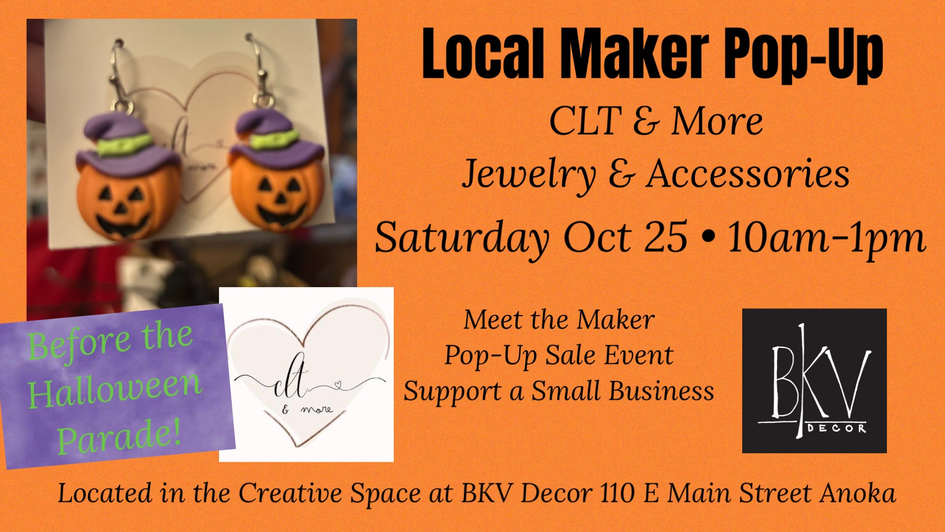 BKV Decor Facebook PageLocal Maker Pop-Up with CLT & More. Support a local maker! Christa T. from CLT & More will be all set up in our Creative Space offering a wide selection of her jewelry and accessories including her adorable charm earrings.